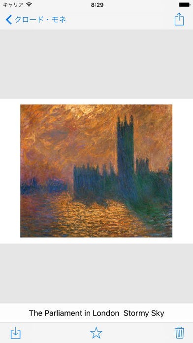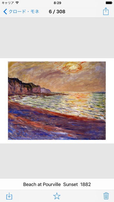 App Storeより引用クロード・モネ(Claude Monet, 1840年11月14日 - 1926年12月5日)は、印象派を代表するフランスの画家。「光の画家」の別称があり、時間や季節とともに移りゆく光と色彩の変化を生涯にわたり追求した画家であった。モネは印象派グループの画家のなかではもっとも長生きし、20世紀に入っても『睡蓮』の連作をはじめ多数の作品を残している。ルノワール、セザンヌ、ゴーギャンらはやがて印象派の技法を離れて独自の道を進み、マネ、ドガらはもともと印象派とは気質の違う画家だったが、モネは終生印象主義の技法を追求し続けた、もっとも典型的な印象派の画家であった。