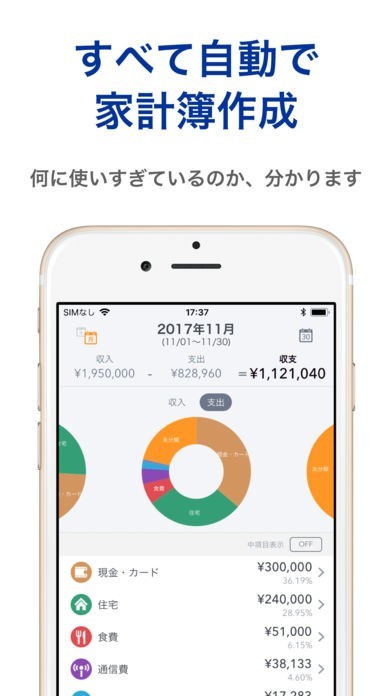 複数の金融機関、クレジットカード、携帯電話、電子マネーの入り払いなどが自動で反映されるため、面倒な数字の入力無しで家計簿が作成できます。しかも使ったお金も自動で費用項目別に分類されます。