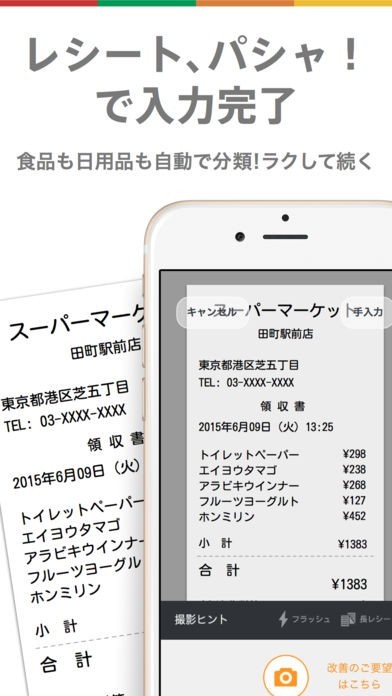 買い物をした際にもらえるレシートを受け取るようにしましょう。iPhoneのカメラでレシートを撮影すれば購入した商品をカテゴリごとに分類して入力することができます。
