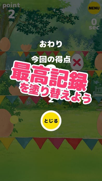 ・キャラが出るたまごは1点もらえます。バツたまごを割るとマイナス1点です。最高得点を目指しましょう!
