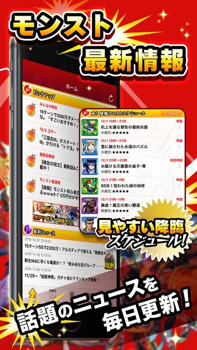 モンストのマルチ募集に役立つ掲示板アプリです。強敵が出現するクエストをクリアしたい時や、他ユーザーと一緒にマルチプレイを楽しみたい時に役立ってくれます。また、モンストの最新情報も掲載しています。