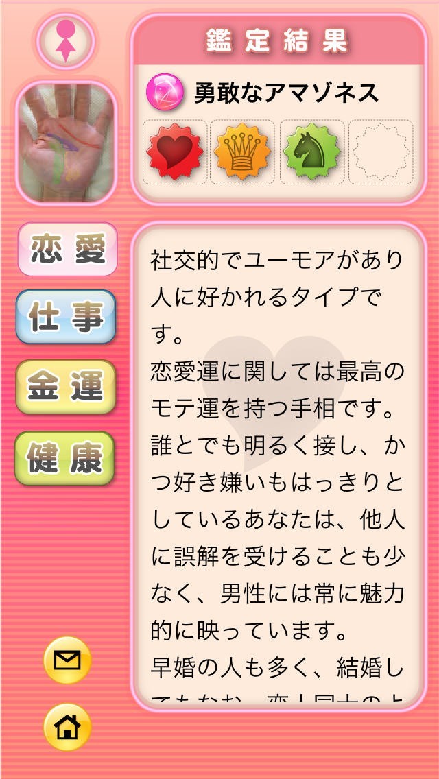 「恋愛」「仕事」「金運」「健康」4ジャンルの鑑定に加えて、「本来のキャラクター」「運気を上げる色」も分かります。