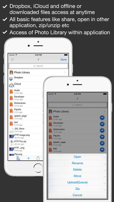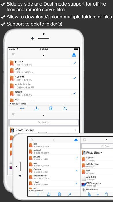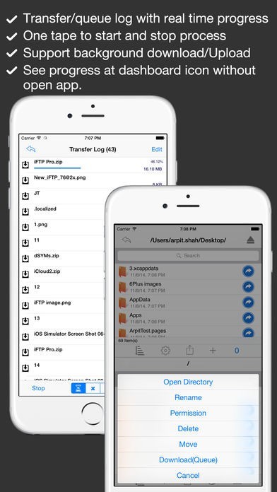 - You can do other work while uploading and downloading process or you can use other application, as iFTP will notify when process will be completed via Local Notification feature