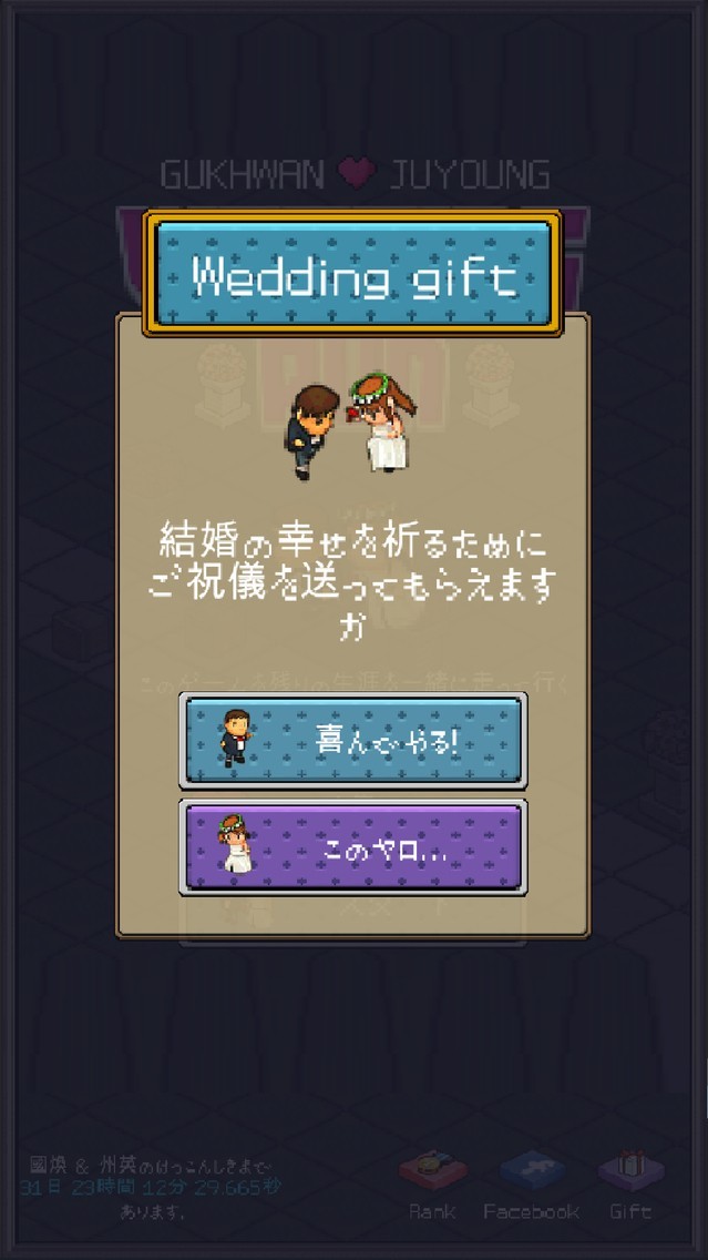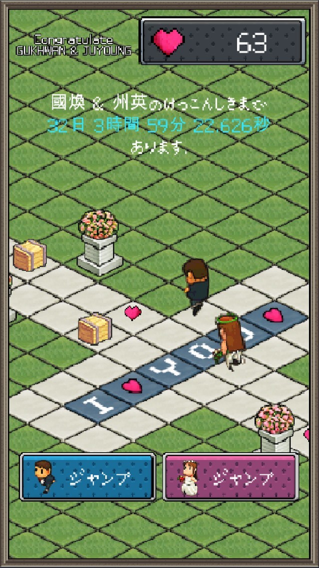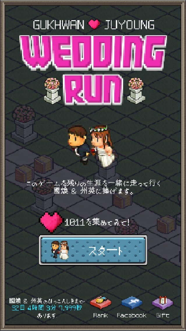 ウェディングランは、結婚式に向けて障害物を乗り越えてエンディングを迎えるために、男女2人で行うゲームです。2人同時に操作します。途中に障害物があり、二人の障害物の位置は少しずれています。難易度が高く、結婚に向かって試練を乗り越えていくところが楽しめます。男性用と女性用のジャンプボタンがあります。それぞれタップして進めていきます。コースに散らばっているハートを集めていきます。1人でゲームすることも可能です。 シェア機能は、Twitterなどでスコアを友達に自慢することができます。仲の良さをアピールしたいときにも便利です。