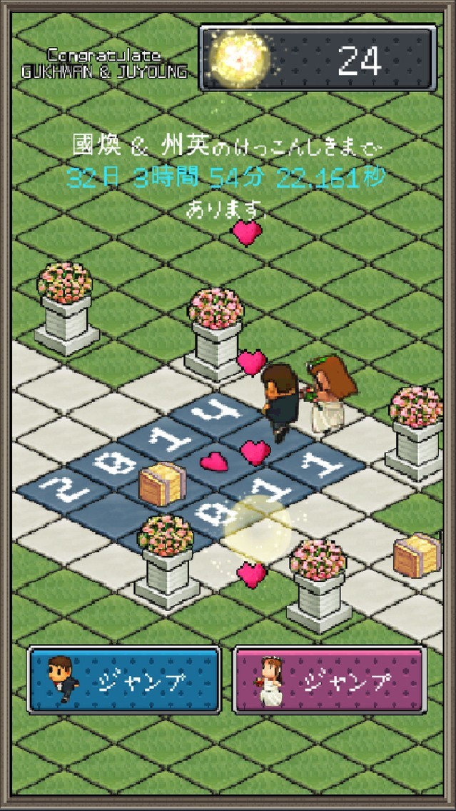 男性用と女性用のジャンプボタンがあり,それぞれタップして進めコースに散らばっているハートを集めていく