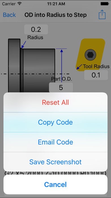 User can choose to copy and paste generated G codes to iPhone clipboard or email the G codes or save a screenshot by simply tapping a button.