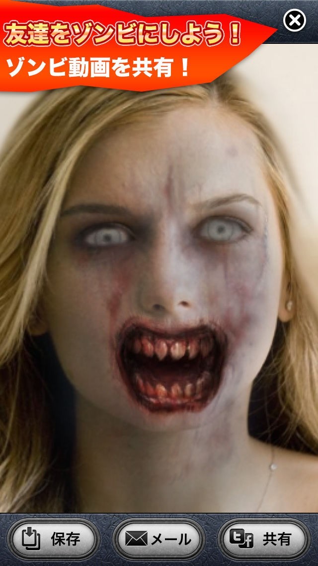 アプリ内のカメラで顔を撮影するだけで簡単に顔をゾンビ化することが出来ます。また、ゾンビ化した画像にタップするとゾンビがかみついてくるといった演出もあるので非常に楽しむことが出来るアプリです。