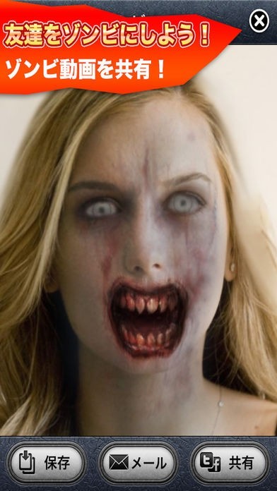 このアプリには死んでいるのに動き出すゾンビのように加工できる顔合成機能が付いています。 まずはゾンビに変身させたい顔写真を用意することが必要です。 無い時はスマホのカメラで撮影しておきます。 お好みでパーツを加えることも可能です。 ゾンビの口元に指を当てると噛みつくような動作を行うため、お友だちや家族をビックリさせたい時にも使えます。 動画共有サービスやSNSサービスへ直接共有できる機能が付いており、離れた場所に居るお友だちに紹介したい時にも便利です。 自分やお友だちがホラー映画やアクション映画などに登場するゾンビになったらどんな印象になるのか知りたい時にも役立ちます。