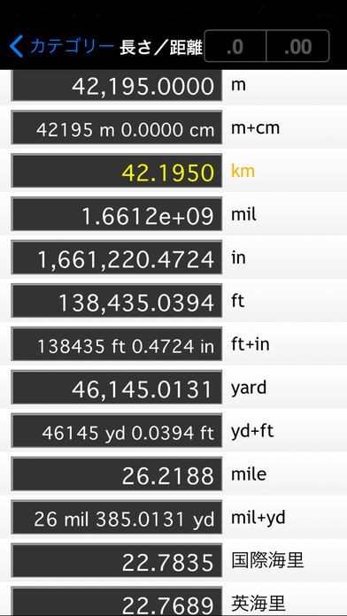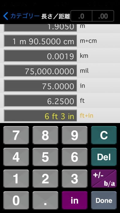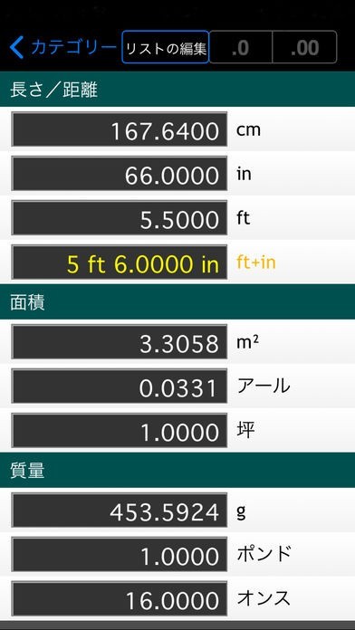 単位変換Proは距離や重さなどの単位を変換できるようになっており、例えばメートルで入力した場合、ヤードやインチ、フィートなどの様々な単位の数値を表示することができます。