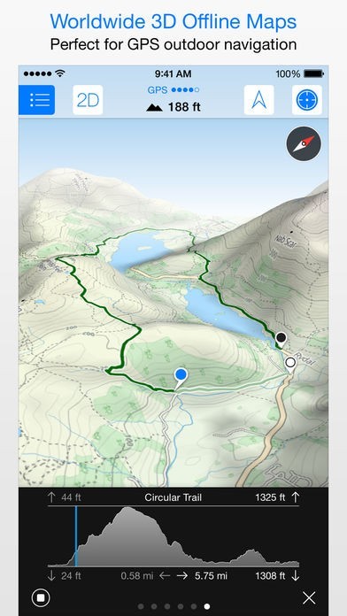 上から見下ろす2Dと起伏が分かる3Dマップを搭載!市街地だけでなく山岳地帯でも使える
