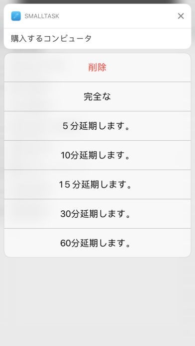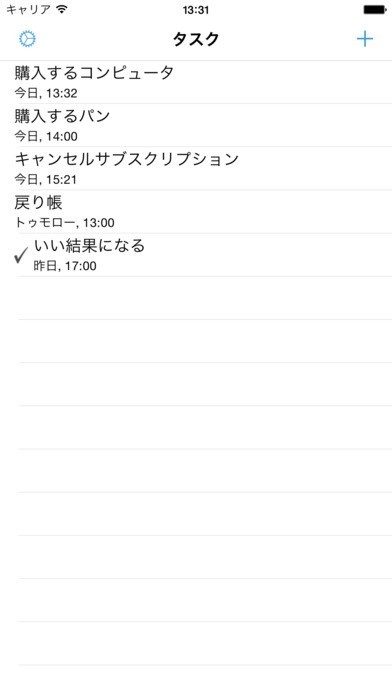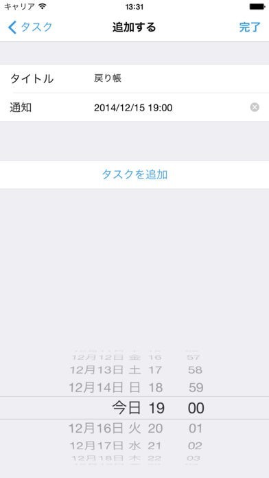 名前を記入し、通知日時を選ぶだけで、簡単に新しいタスクを追加する事ができます。タスクが完了した際も、簡単にそれを削除し、リストから消す事も可能です。(タスクを削除するには、iPhone/iPadを右/左に振ってください)
