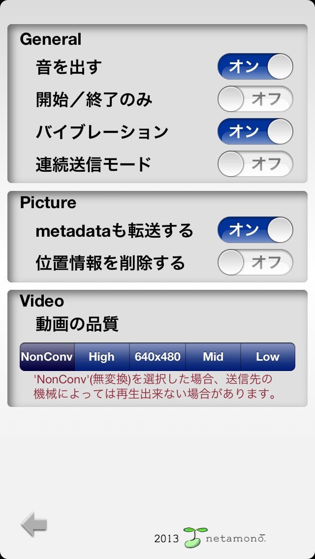 ※動画の品質を「High」以上にした場合、転送先のハードウェアによっては、保存、再生が出来ない場合があります。