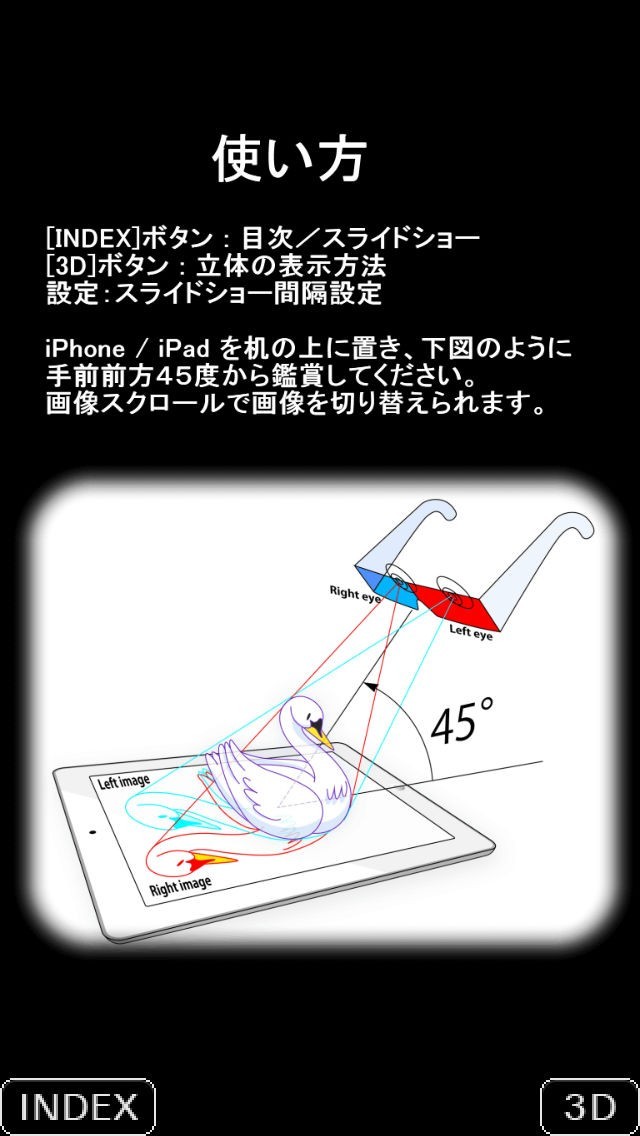 "とびだす絵本 白鳥"は、湖を泳ぐ白鳥の写真やビデオを3Dで鑑賞することかできます。まるで目の前に白鳥がいるかのような臨場感や優雅さに、驚きやワクワク、癒しを感じることでしょう。