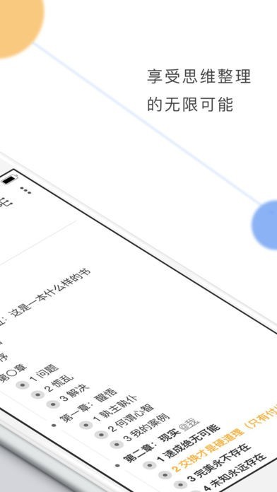 快速的整理思路,一键查看思维导图。养成结构化的思维方式,不断拆分细化每一个主题,释放大脑。一键分享、演示,方便的进行思维碰撞与头脑风暴。