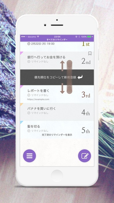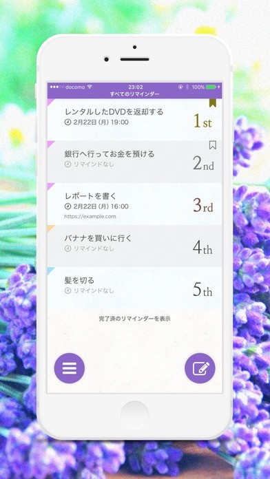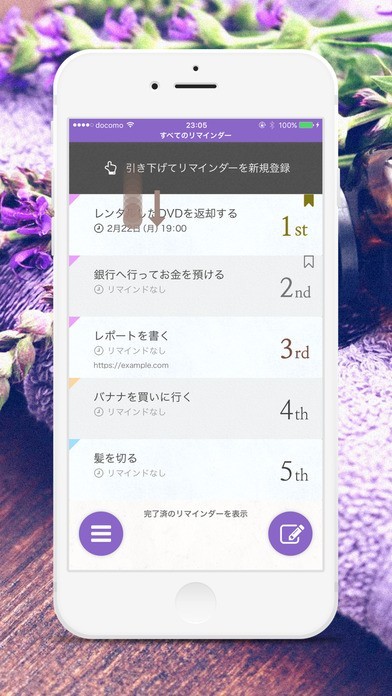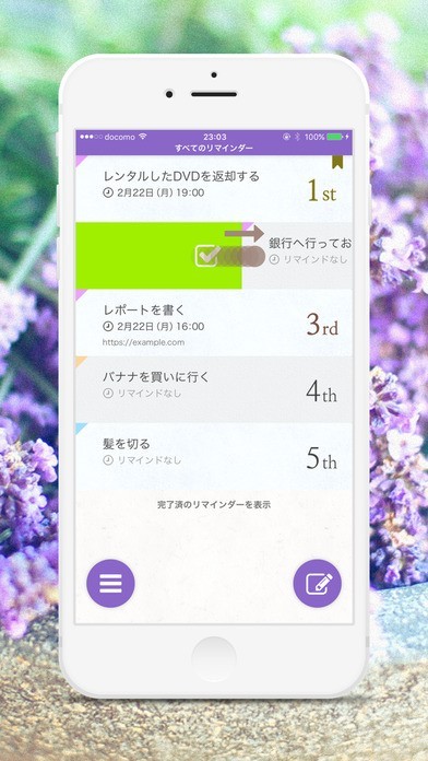 優先順位がすぐに分かるタスクをお探しの方には「ナラベンダー」が役立ちます。リマインダーと連携しているので、一方で書いた内容がもう片方にも反映される仕組みになっています。まずは画面をスワイプしてやるべきリストを入力しします。次に、その重要性を5段階で評価することができます。重要度に応じてリマインダー一覧が表示された時に、優先的にタスクが並ぶので忘れる心配がありません。タスクの用事が完了すると、こちらもスワイプをするだけで簡単に終了することができます。仕事でやるべきことが山積している時でも、このアプリを使うと視覚にも見やすくタスクを管理できます。
