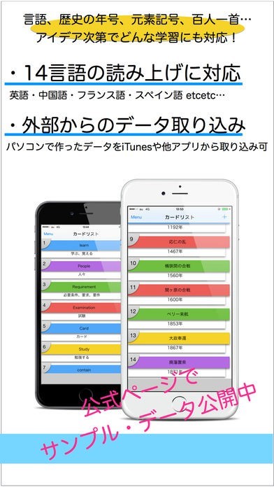 「わたしの読み上げ単語帳」は、20万ダウンロードを突破した単語帳アプリです。 語学学習はもちろんのこと、百人一首や年号の暗記など、アイディア次第で多彩な使い方ができるのが特徴です。 読み上げ機能を搭載しており、英語、フランス語、スペイン語などの14か国語に対応可能。 記憶済みのカードの割合表示も行えるため、モチベーションを維持しながら学習を続けることができます。