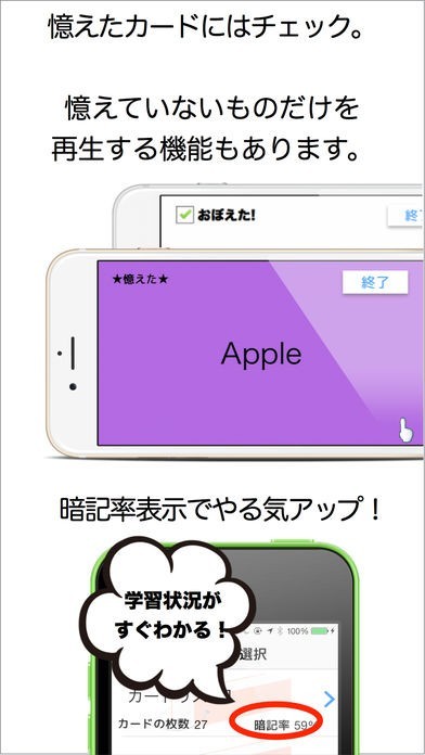 記憶済みのカードの割合表示も可能!モチベーションを維持しながら学習を続けられる!