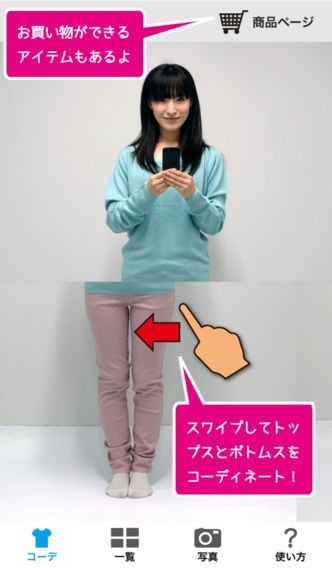 画面の上部をフリックするとトップスが変わり、下部をフリックするとボトムスが変わっていきます。トップスの丈の位置を調節すれば、あたかも着たかのようにコーディネートできます。