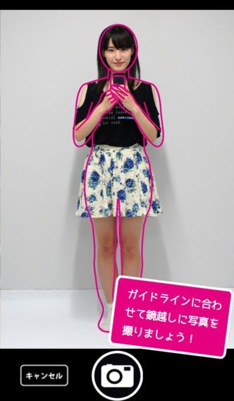 画面のガイドラインに合わせて、全身鏡の前で鏡越しに撮影をします。