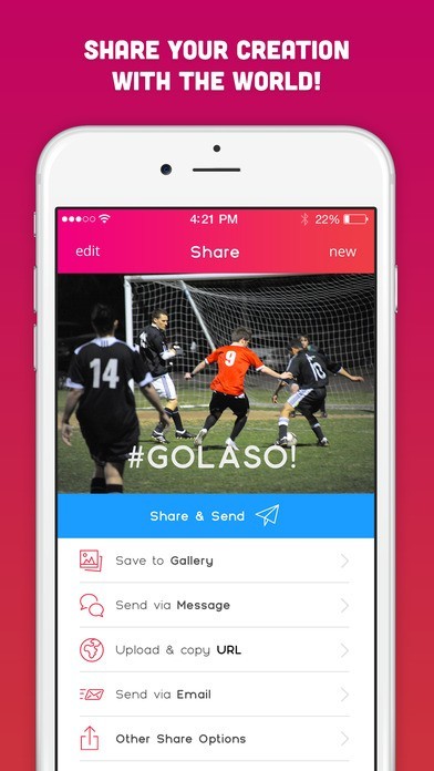 便利な共有機能を用意しています。完成した作品はSNSやメールでシェア可能。TwitterやFacebookに投稿して、友達と一緒にワイワイ盛り上がることもできるようになっています。