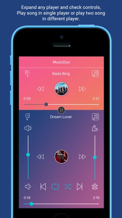 App Storeより引用MusicDuo is beautifully crafted masterpiece. This app lets you listen to 2 songs at the same time. It's beautiful yet user-friendly interface will increase the joy of listening the song. You can share your earphone with the partner and listen different song in each ear-peace with this app.You can also listen song in the background and continue your work on mobile, App also works on lock mode. Compare your recording Memo on the dual player.