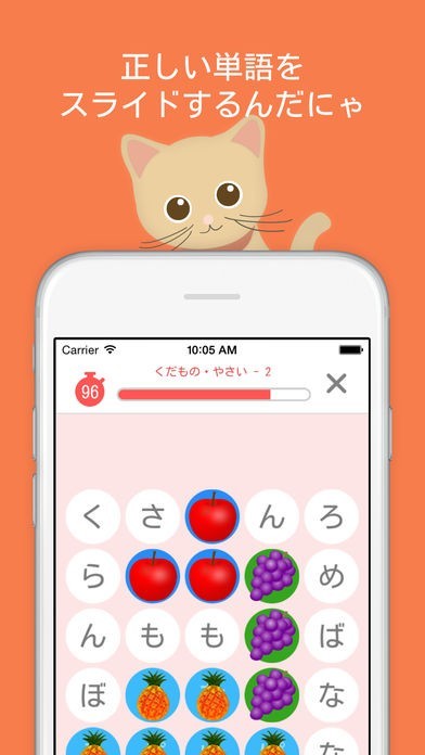 野菜や果物、動物の名前(ひらがな)を、スライド選択して覚えるシンプルでゲーム感覚で学べます。