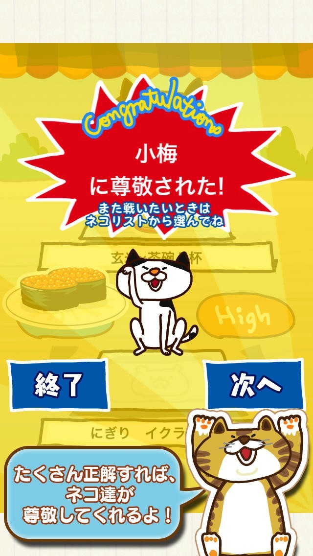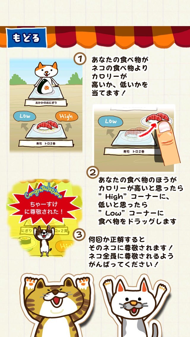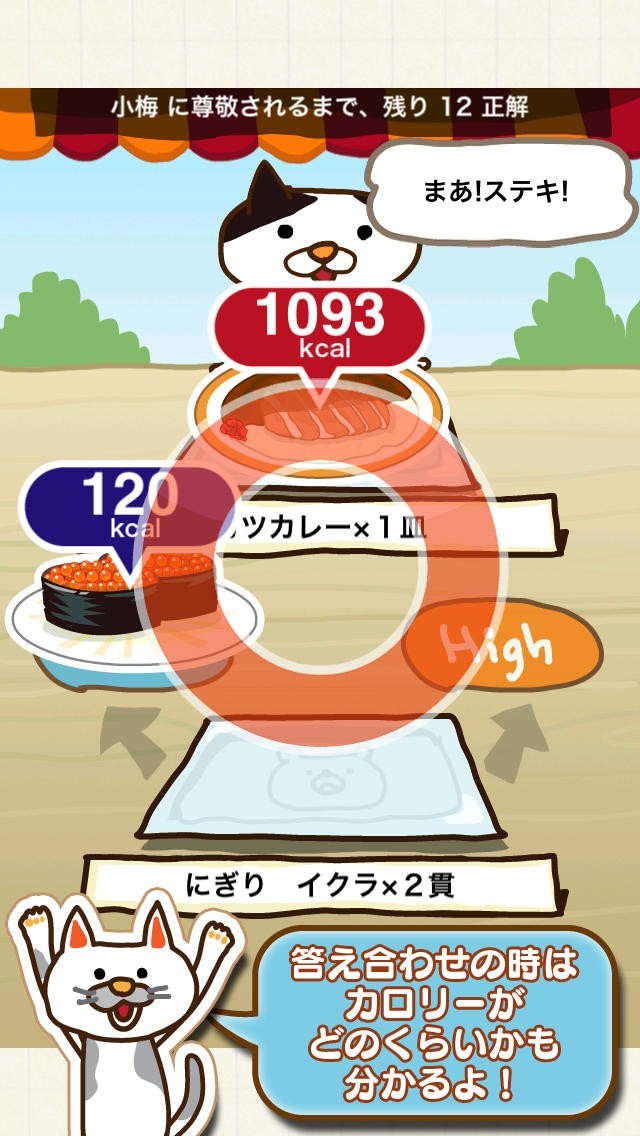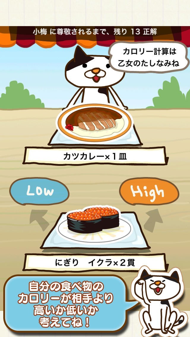 このゲームは食事についての知識を得ながら遊ぶというようなことが出来るゲームです。 2つの食べ物が表示されて、カロリーが「High」か「Low」かを選んでいくだけです。 操作もタップによってすべて行うことが出来ます。 正解した場合はツイッターのアイコンボタンが出てきて、すぐに投稿することが出来るようにしてくれます。 さらには、リストには対戦したキャラクターたちが載るので、たくさんの相手と対戦していくことがモチベーションにもなります。