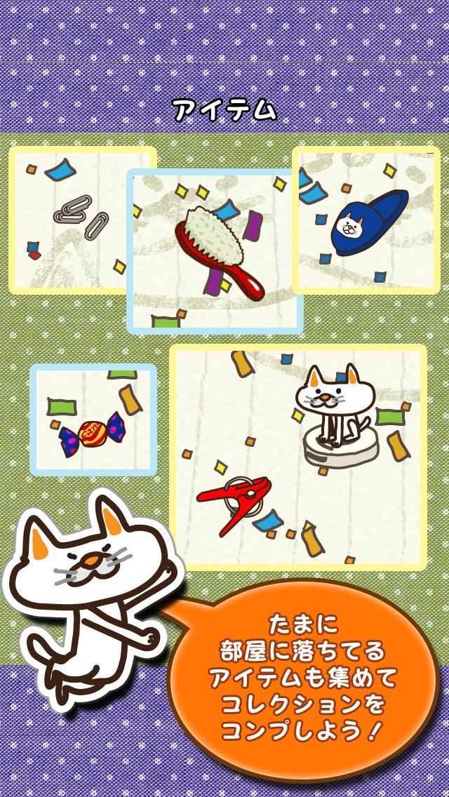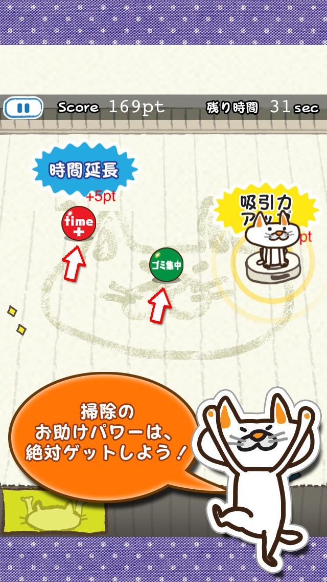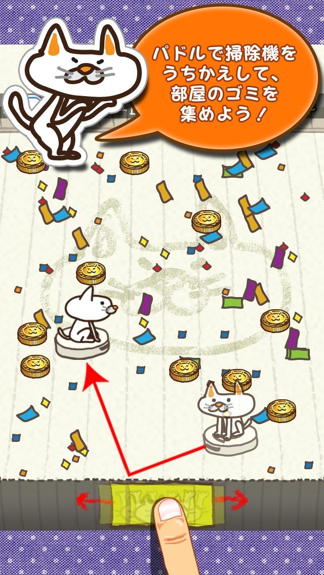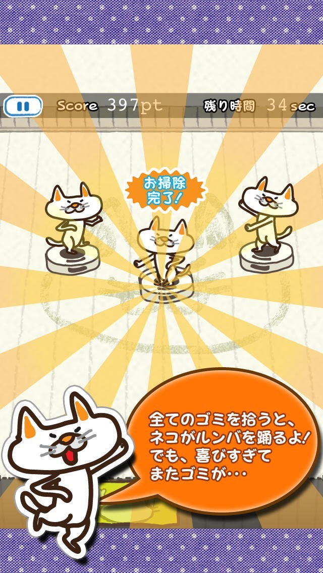 お掃除ロボットにのったネコで操作してお部屋を綺麗にしよう! お部屋が綺麗になるとネコは嬉しくてルンバダンスを踊ります! でもその喜びもつかの間‥。 パドルでお掃除ロボットを打ち返す、新感覚のブロックくずしゲームです。 たくさんお部屋を綺麗にしてネコを喜ばせてあげましょう。 ロボットの上でダンスを踊るネコちゃんがとってもかわいいです。 吸い込むのはゴミだけではなくスリッパや、クリップ、飴などなど‥。 アイテムもどんどん吸い込んで図鑑をコンプさせよう! 他にも時間延長や、吸引力強化などのお助けアイテムなども出現するよ! スコアランキングや、あつめたゴミの数、ルンバを踊った回数などなど‥ いろんな成績でお友達や家族と競って遊べます!