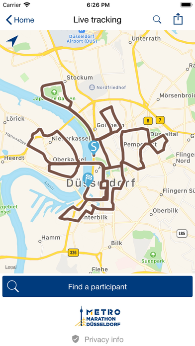 App Storeより引用The METRO Marathon Dusseldorf mobile app is the most complete app for the ultimate event experience. It features live tracking of all participants (without using their phones), social media integration, interactive course maps, selfies and all information you need to know about the METRO Marathon Dusseldorf.