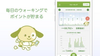 厚生労働省が推奨する、一週間の規定歩数である男性が64,400歩、女性が58,100歩を達成すると、アプリにポイントがたまっていき、ポイントが貯まるとトクホ飲料がもらえるから一石二鳥で健康増進できます。