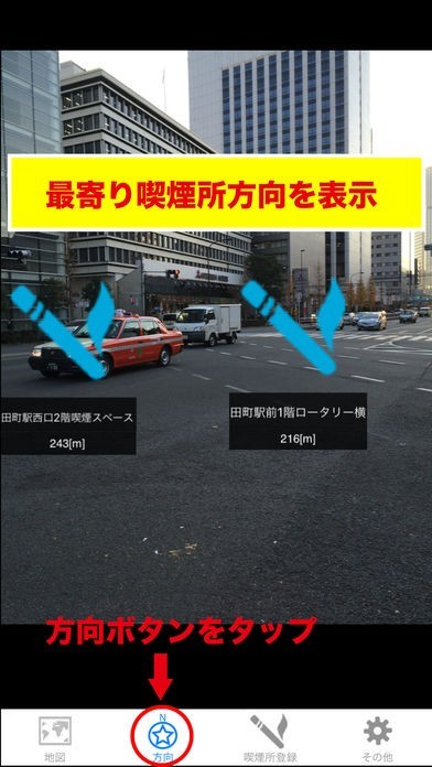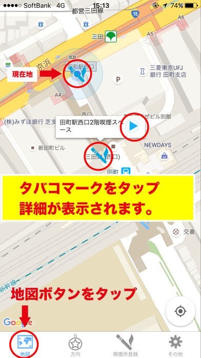 ・現在地からおよその喫煙所までの距離方向もわかります。
