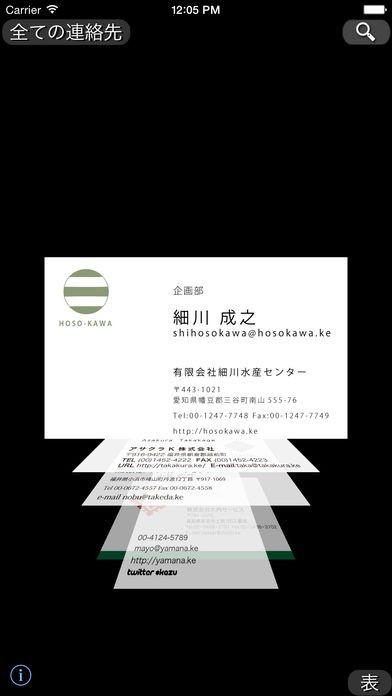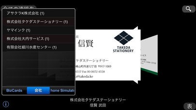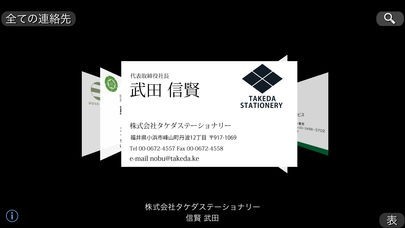 「Biz.Cards」は、スマートフォンのカメラを使って名刺を保存してカバーフローのように次々と閲覧することができるアプリとなっていて、ライブラリの画像も利用できます。