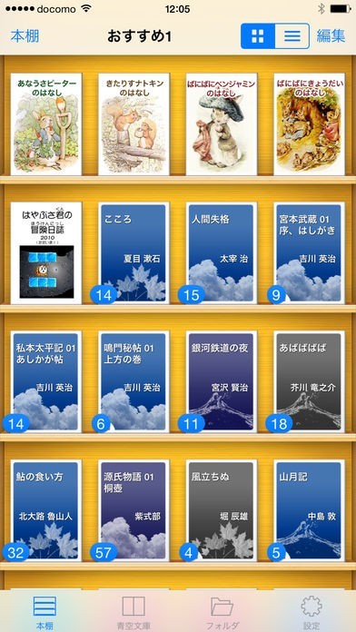 txtなどのファイルをページを捲りながら読書できるだけではなく、管理するコンテンツの表紙画像を表示できます。フォルダでは表紙とタイトルが本の表紙のデザインで整理されています。