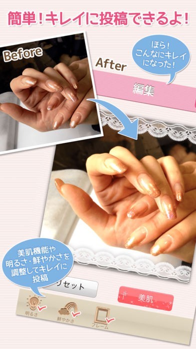 「nailap 可愛いネイル共有」はネイル専用の写真投稿アプリです。プロのネイリストも多数ネイルアート写真を投稿しているので新しいネイルのデザインを考えている人は参考にすることができるようになっているだけでなく、自分で満足できるネイルが完成したら他のユーザーに見てもらうために写真を投稿することもできます。ネイルを撮影した写真を加工することもできるようになっているので、よりかわいく加工した後で投稿することが可能です。投稿されているネイルの写真はテイスト、カラー、デザインのカテゴリーごとに分けられているので参考にしたい写真を探しやすくなっています。