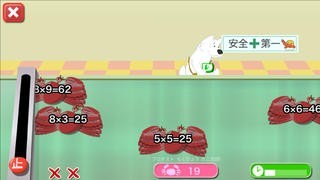 かけざんをつけたカニが流れてくるので、その答えがあってたらシールを貼ります。