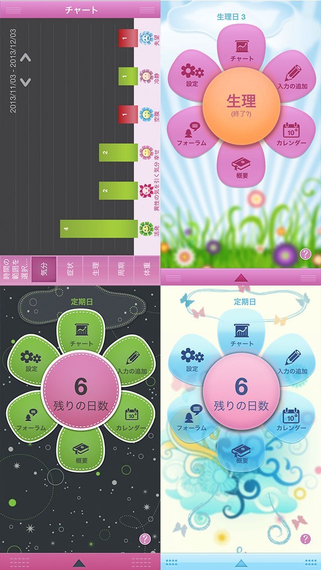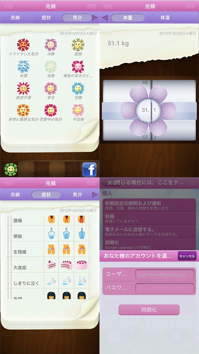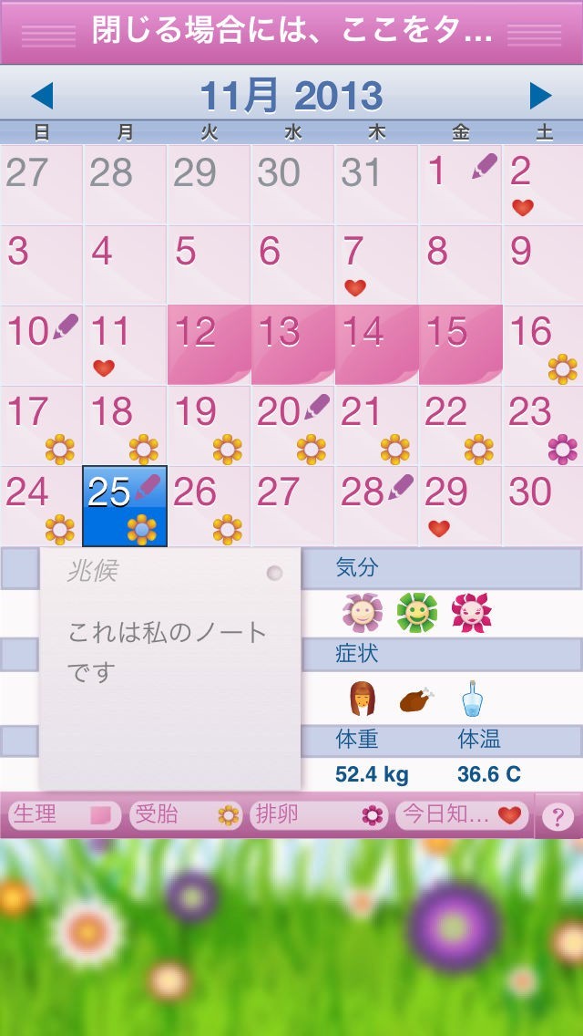 「生理日記」は生理周期の管理だけでなく、毎日の日記をつけることが出来るアプリです。数種類ある顔文字の中からその日の気分を選択したり、腰痛・便秘・過食などの体に関する症状を記録することが出来ます。また、体重や体温の入力も可能です。