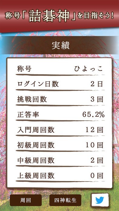 詰碁を解いた記録はアプリに記録されます。ログイン回数、挑戦回数、入門周回数、正答率などが一度に表示されます。どれだけ練習したのか、後から振り返るときに便利です。