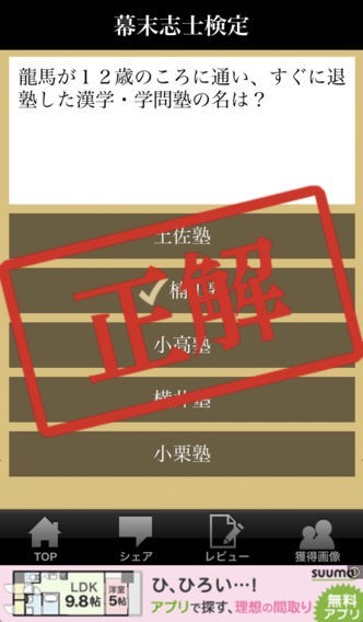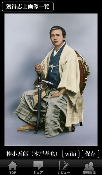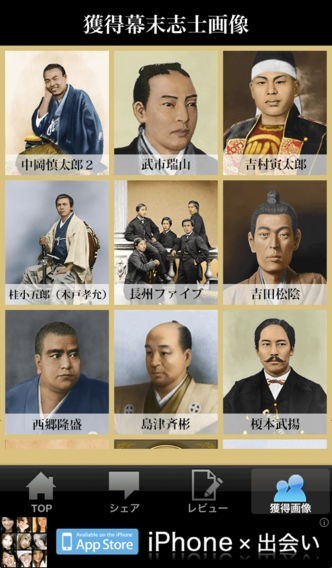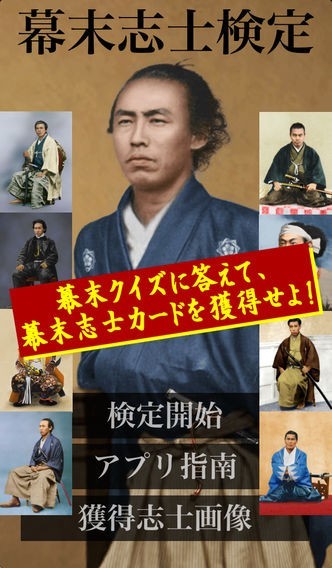App Storeより引用日本史・幕末クイズに答えて、総天然色幕末志士カラーカードをGETせよ!