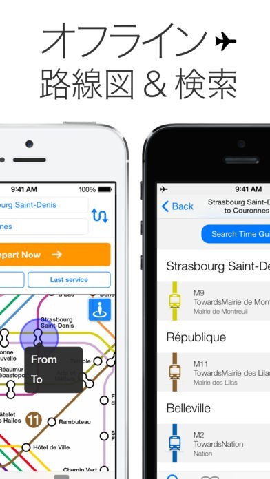 路線図と乗換検索はオフラインでも利用できます。通信ができない旅行中でも便利です(時刻を指定した乗換検索は通信が必要となります)。