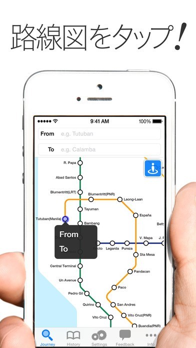 このアプリでは、マニラのMRT、LRTおよび国鉄を網羅した路線図を使い、無料で乗換検索が可能です。また地図上で目的地を選択することができ、操作も簡単です。