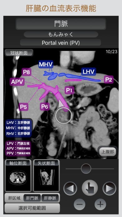 このアプリでは、画像に触れるだけでその解剖名称を表示し、すぐに目的とする箇所を調べられるだけでなく、軸位断面・冠状断面・矢状断面の切り替え表示が可能であり、選択部位の位置関係を瞬時に把握することが出来ます。