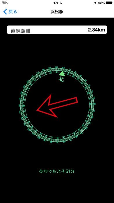 コンパス機能があり、目的地への方向をコンパスで示してくれます。直線距離や目安時間が同じ画面で表示されるので、遠くても励みになります。迂回経路は表示されないので、できるだけ最短距離でたどり着けます。