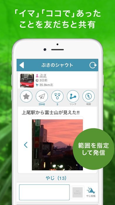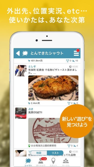 散歩中や通勤中等の移動中になにか珍しいことが起きたなら、それをシャウト(投稿)でき、友達等の他のユーザーとシェアできます。これにより、日常のちょっとしたことでもすぐに共有できるようになります。