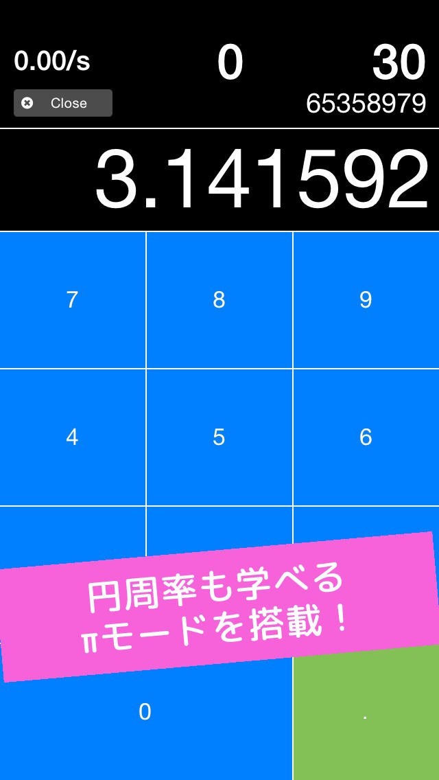 通常の電卓風タイピング以外に、円周率を打ち込むためのπモード、時間に関係なくだらだらと円周率を打つことのできるインフィニティモードを搭載しています。