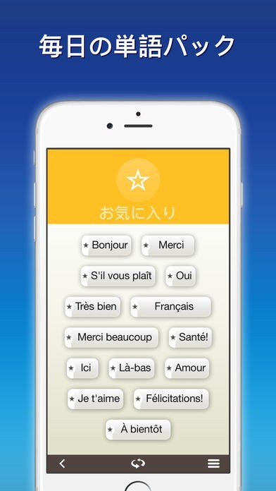 「Nemo フランス語」は、自分のペースに合わせてしっかり学べるフランス語専用学習アプリです。 単語と熟語を多数収録。日常生活で利用頻度の高い言葉はもちろん、旅行の際に便利なフレーズも収録されているのが嬉しいポイント。 すべての単語と熟語には、ネイティブによる読み上げ音声を収録しています。 録音機能を搭載しており、マイクボタンをタップすることで自分の声を録音可能。 続いて再生されるネイティブの発音と聴き比べることで、正確なアクセントを覚えられるようになっています。