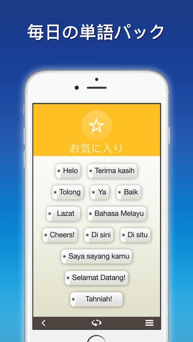 1日のうちに学習した全ての単語やフレーズを確実に暗記するために寝る前にもう1度総復習することができる夜間レビューモードが搭載されています。その他にも、なかなか覚えられない単語をお気に入りに登録して繰り返し復習することができます。