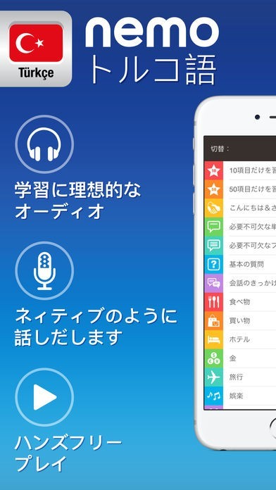 ネイティブのトルコ語音声を使った本格的なリスニングおよびスピーキング能力学習が行えます。また、ハンズフリーでも使う事が出来るのも、このアプリの特徴となっています。
