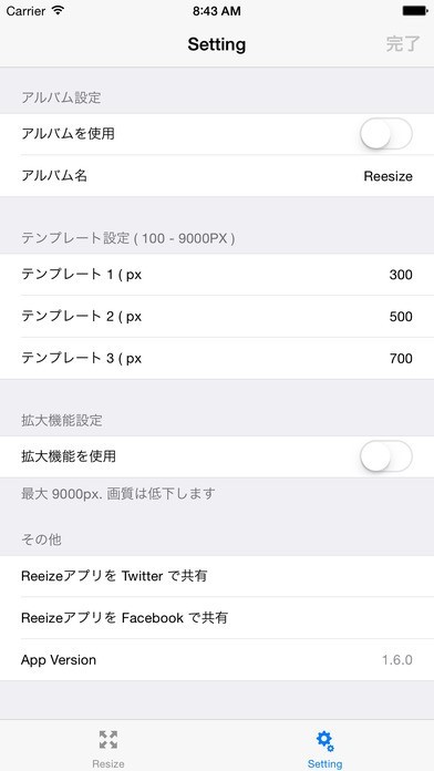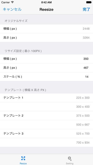App Storeより引用写真、画像のサイズ(解像度)を変更して保存するシンプルなアプリです。