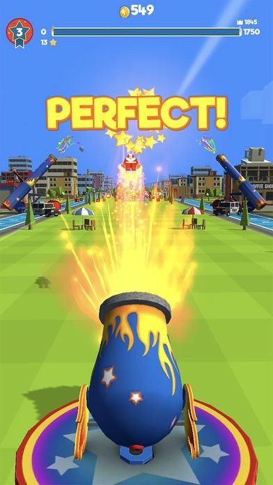 左右に動いている大砲が真っ直ぐ前を向いた瞬間にタップするほど飛距離が伸びます。ベストなタイミングで発射できた時には「完璧」の表示が出るので、爽快感を得られます。