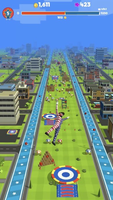 コース上にはバルーンやトランポリンなど様々なギミックが登場し、うまくぶつかったり着地すると飛距離を大幅に伸ばすことができます。スワイプ操作でキャラクターをうまく導くことが重要です。